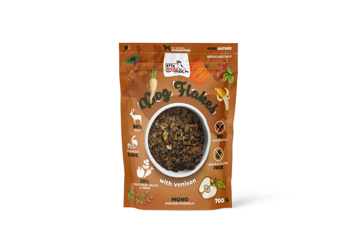 Kosmiči za pse divjačina so zakladnica koristnih vitaminov, mineralov in bioaktivnih spojin, priporočljivi za pse s kožnimi in prebavnimi težavami, oslabljeno imunostjo ter starostnike, ki potrebujejo dodatno prehransko podporo. Poleg tega ta mešanica izboljšuje delovanje jeter, ledvic, sečil in v celostnem pristopu izboljša počutje psa.