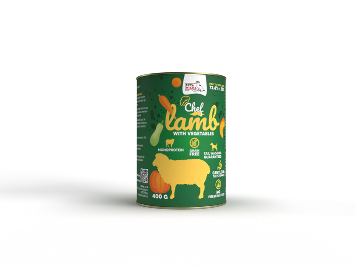 Chef mokra hrana za pse - jagnjetina je ustvarjena z ljubeznijo in strokovnim znanjem, da vašemu psu ponudi najboljše. Glavna sestavina je visokokakovostna jagnjetina, ki predstavlja 92,6 % sestavin, vključno s kar 72,6 % mišičnega mesa. Ta beljakovinska bomba ne samo, da ohranja mišično maso vašega psa, ampak mu tudi zagotavlja energijo za aktivno življenje.
