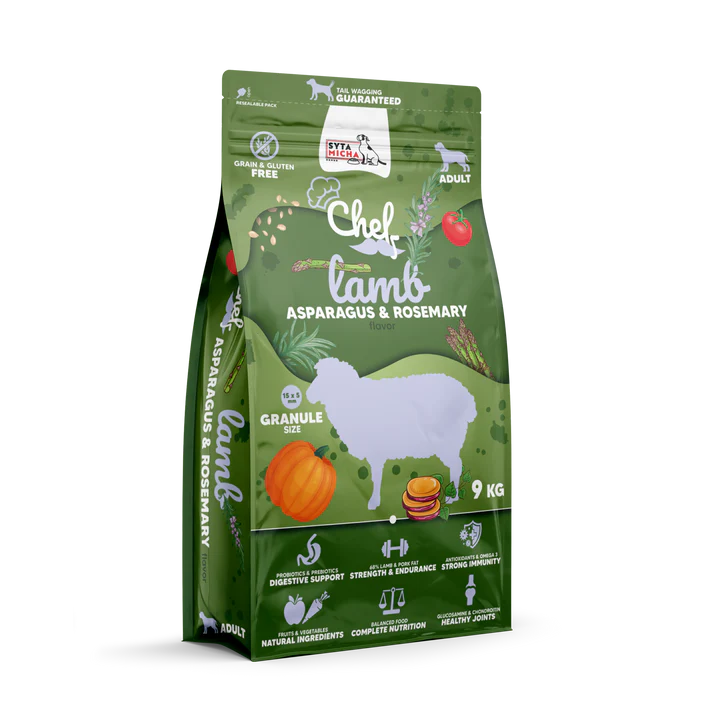 Chef suha hrana za pse s probiotiki – jagnjetina je popolna formula brez žitaric za odrasle pse. Gre za uravnotežen obrok, ki vsebuje kar 60 % jagnječjega mesa, odličnega vira beljakovin, potrebnih za ohranjanje mišične mase in primerne telesne teže.