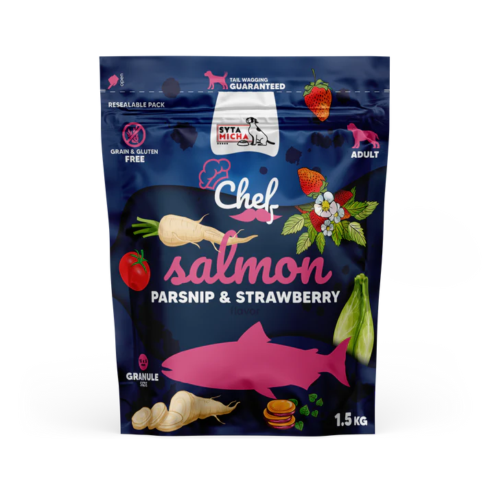 Chef suha hrana za pse s probiotiki - losos je več kot le obrok. Je premišljeno zasnovana prehrana, ki skrbi za celostno zdravje vašega ljubljenčka in zagotavlja zadovoljstvo ob vsakem grižljaju.