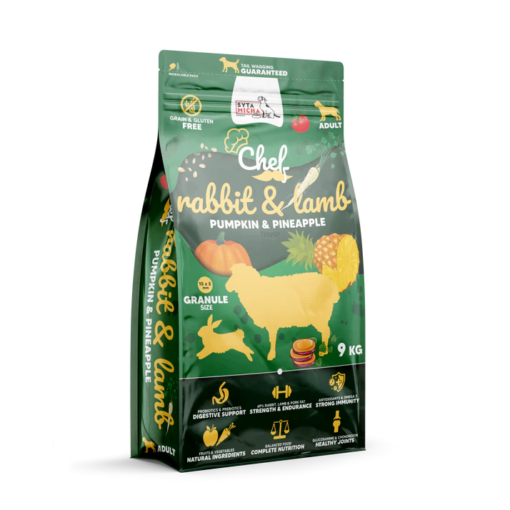Chef suha hrana za pse s probiotiki – zajec in jagnjetina je popolna formula brez žitaric za odrasle pse. Gre za dobro uravnotežen obrok, ki vsebuje kar 60 % zajčjega in jagnječjega mesa – odličnih virov beljakovin, potrebnih za ohranjanje mišične mase in primerne telesne teže.