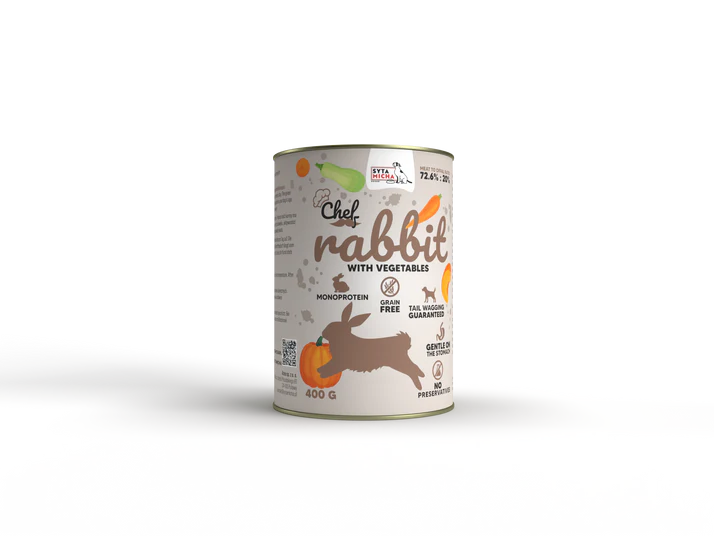 Chef mokra hrana za pse - zajec s skrbno izbranimi naravnimi sestavinami in vrhunskim kunčjim mesom je ta mokra hrana zasnovana tako, da vašemu psu zagotavlja popolno prehransko izkušnjo. Naj bo vsak obrok praznik za vašega štirinožnega prijatelja, poln hranil, ki podpirajo njegovo zdravje in vitalnost!