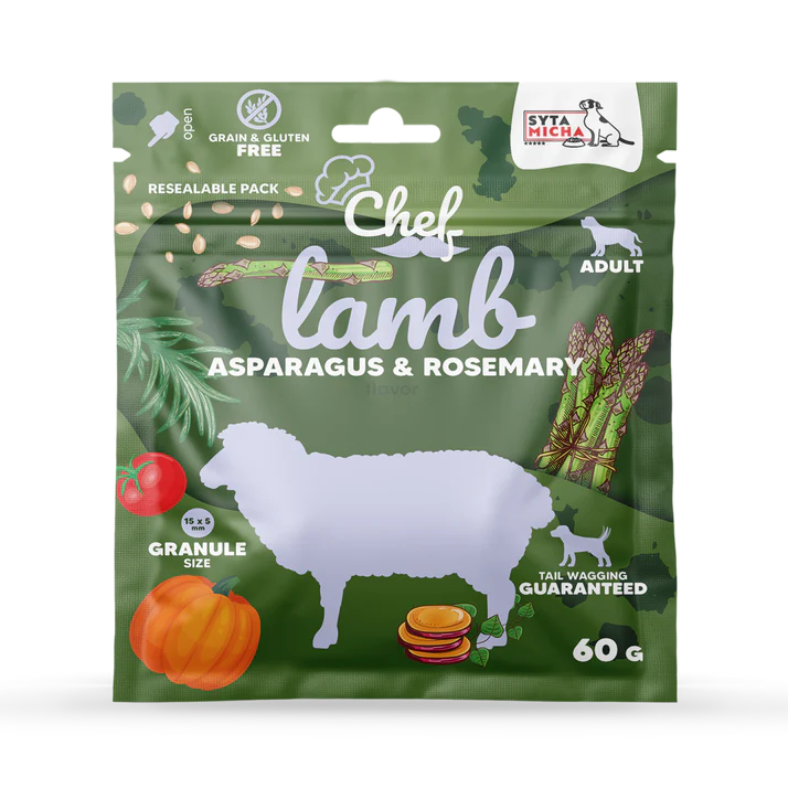 Suha hrana za odrasle pse z jagnjetino, šparglji in rožmarinom.
