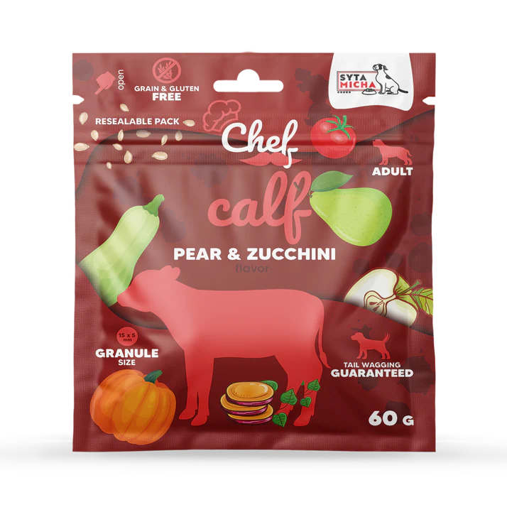 Chef suha hrana za pse s probiotiki - teletina - Teletina, hruška in bučke je popoln obrok, ki ne le zadovolji apetit vašega ljubljenčka, ampak mu zagotovi tudi vrhunsko podporo za zdravje.