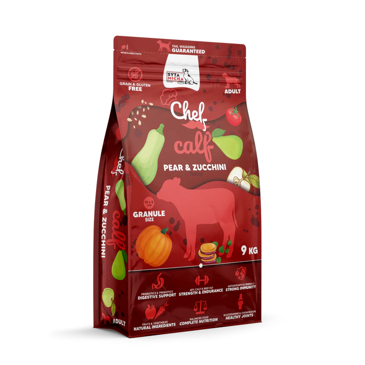Chef suha hrana za pse s probiotiki - teletina - Teletina, hruška in bučke je popoln obrok, ki ne le zadovolji apetit vašega ljubljenčka, ampak mu zagotovi tudi vrhunsko podporo za zdravje.