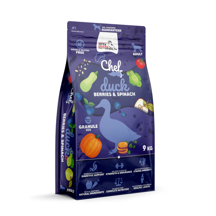 Chef suha hrana za pse s probiotiki – raca je monoproteinska, popolna formula brez žitaric za odrasle pse. Je uravnotežen obrok, ki vsebuje kar 60 % račjega mesa, odličen vir beljakovin za ohranjanje mišične mase in primerne telesne teže.