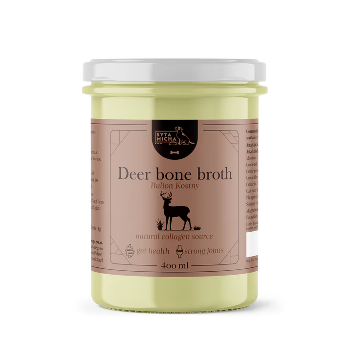 Ne glede na starost ali velikost vašega psa, jelenova kostna juha za pse je odlična izbira za vsakogar. Z edinstveno kombinacijo hranil, ki podpirajo zdravje sklepov, prebavo, imunski sistem in živčni sistem, je ta juha popoln dodatek za vašega psa. Naravno zdravje in vrhunska kakovost v vsaki kapljici – privoščite svojemu psu najboljše!