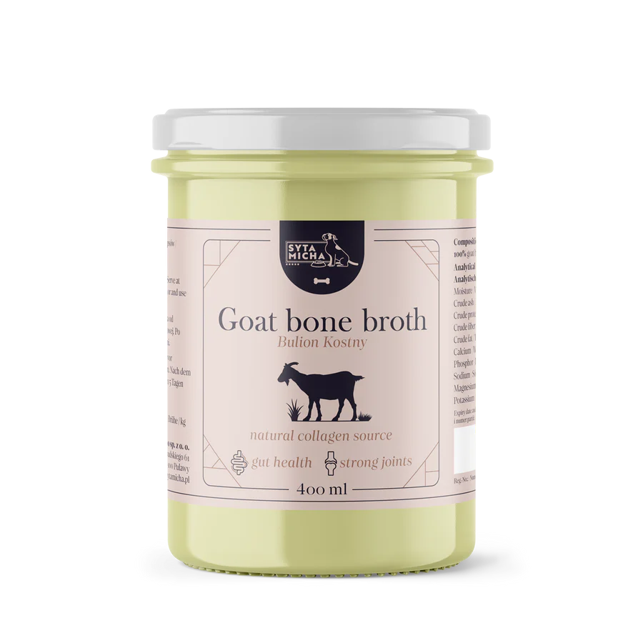 Ne glede na starost ali velikost vašega psa, kozja kostna juha za pse je odlična izbira za vsakogar. Z edinstveno kombinacijo hranil, ki podpirajo zdravje sklepov, prebavo, imunski sistem in živčni sistem, je ta juha popoln dodatek za vašega psa. Naravno zdravje in vrhunska kakovost v vsaki kapljici – privoščite svojemu psu najboljše!