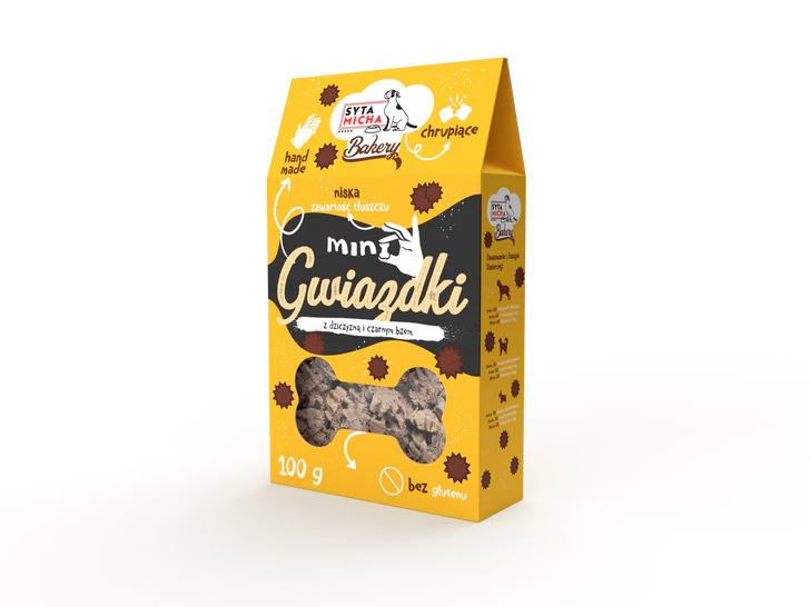 Piškoti za pse mini zvezdice z divjačino in bezgom so ročno izdelani, pečeni pasji piškoti. Neverjetno hrustljavi, drobni prigrizki, katerih sestava temelji na divjačini, bogati z beljakovinami in železom, ter plodu črnega bezga, viru vitamina C in vitamina A, s protivirusnimi in imunomodulatornimi lastnostmi. Mini zvezdice poleg drugih zdravju koristnih dodatkov vsebujejo celulozo, kumino, timijan in kvas.